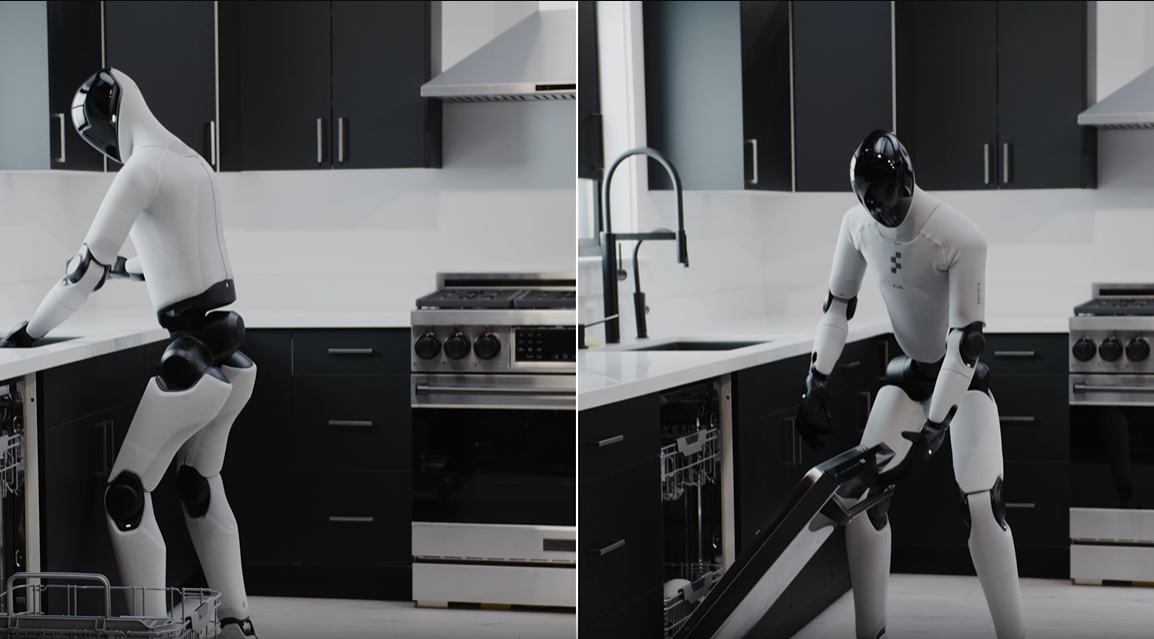 The robot can unload and reload a dishwasher across a full-sized kitchen without resets or human help. It completes 61 actions in sequence while walking, carrying fragile objects, and recovering from minor shifts.