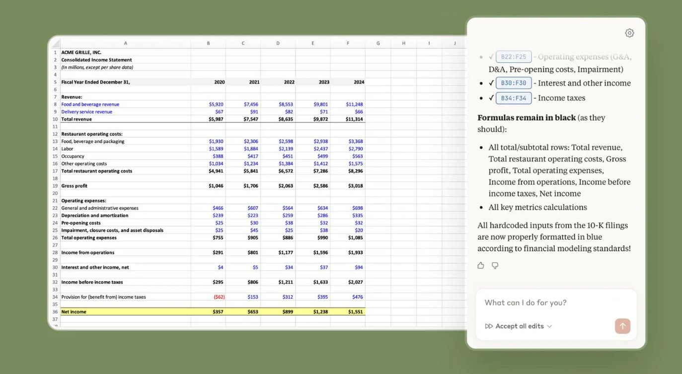 1) Claude now sits inside your spreadsheet - Claude runs in a sidebar inside Excel and can read your full workbook, including nested formulas and cross-tab dependencies, making it easier to debug complex sheets without manually tracing every link.