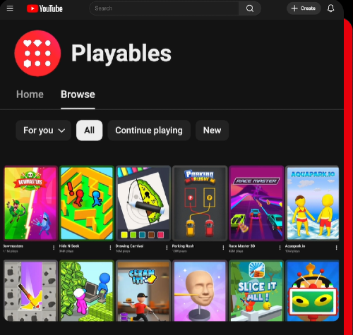 Playable games run on YouTube web and mobile, distributed like regular content.