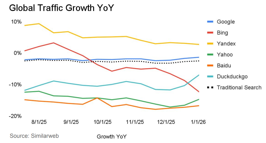 4. Search and discovery are redistributing - Traditional search stayed roughly flat at ~-1% to -3%. Reddit grew ~12% while Quora fell ~53%, signaling where trust and discovery are shifting.
