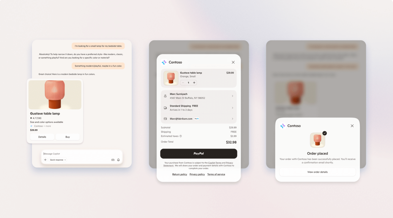 1. Checkout happens inside the conversation - Copilot Checkout lets users complete purchases without redirects, using natural dialogue to move from discovery to payment. Payments run through PayPal, Shopify, and Stripe while merchants keep full control.