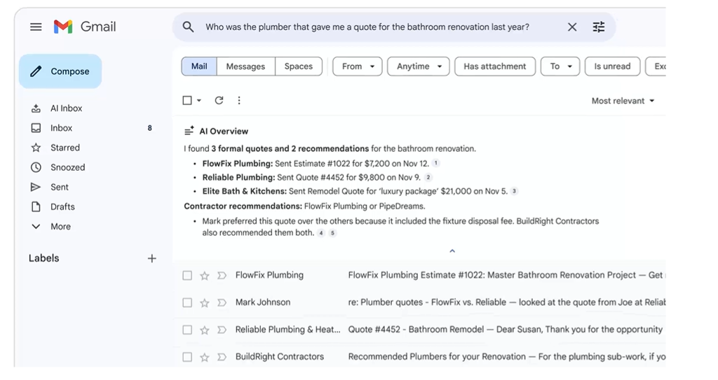 1. Ask your inbox questions with AI Overviews - Gmail can now summarize long conversations and answer natural-language questions by pulling key details directly from emails without requiring keyword searches.