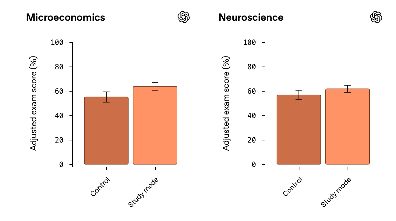 Test Scores Alone Don't Tell the Story: An early study with 300+ college students showed ~15% higher exam scores in microeconomics when using AI study mode. But results varied by subject, and short-term gains don't reveal whether learning habits actually improve over time.