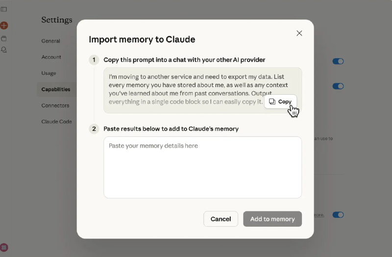 One-Prompt Migration: Users paste a provided prompt into their existing chatbot, then upload the generated output into Claude’s memory settings. Within 24 hours, Claude reconstructs prior instructions, personal details, and workflow preferences.